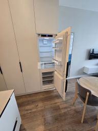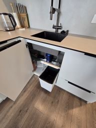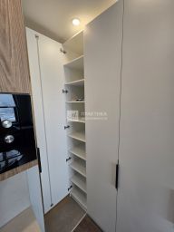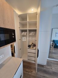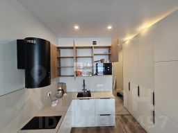 Кухня оборудована всем необходимым: встроенный холодильник, микроволновая печь, варочная панель, посудомоечная машина, рециркуляционная вытяжка, измельчитель отходов, фильтр "Барьер" с обратным осмосом. Также предусмотрены тарелки, кружки и столовые приборы. Шкафы и кухонный гарнитур выполнены из материалов премиального качества Egger с фурнитурой Blum.
