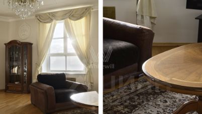 Бонус партнёрам 50%. Видовая квартира с 2-мя спальнями общей площадью 115 м² в доме на Кутузовском проспекте, напротив делового центра "Москва-Сити". Выполнен светлый ремонт в классическом стиле. Интерьер украшен изящной лепниной, на полу уложен паркет. Спланирована просторная гостиная с обеденной зоной, кухня-столовая, 2 спальни, ванная комната с джакузи, холл. Квартира укомплектована классической мебелью из дерева, современной бытовой техникой. Установлена система кондиционирования. Из гостиной открываются панорамные виды на реку и "Москва-Сити".