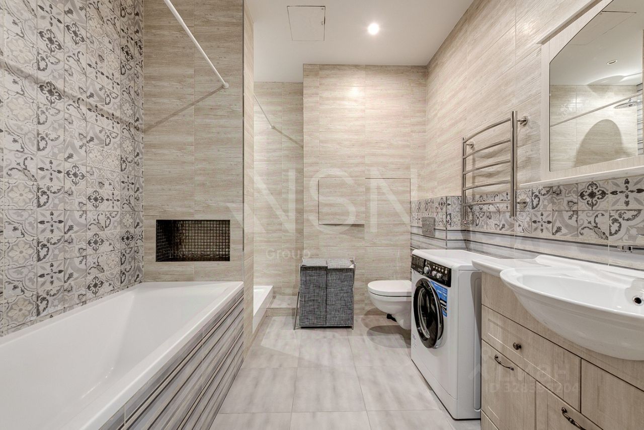 2 санузла гостевой и совмещенный с ванной и душем. В спальной зоне двухспальная кровать и гардеробная. Теплые полы в ключевых зонах!