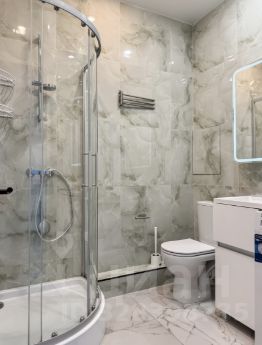 Кухня-гостиная — сердце квартиры: здесь удобно готовить, принимать гостей или проводить уютные вечера. Обеденная зона, мягкий диван и телевизор создают атмосферу настоящего дома. Современный санузел с душевой и зеркалом с подсветкой добавляет ощущение комфорта и стиля.