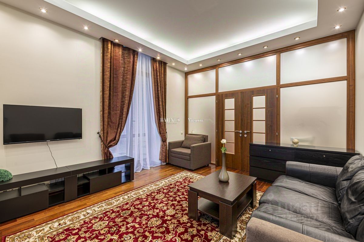 Квартира полностью меблирована и оборудована всей необходимой бытовой техникой, включая посудомоечную машину, духовой шкаф, стиральную машинку с сушкой. Канальное кондиционирование для идеальной температуры. Паркет из натурального красного дерева.