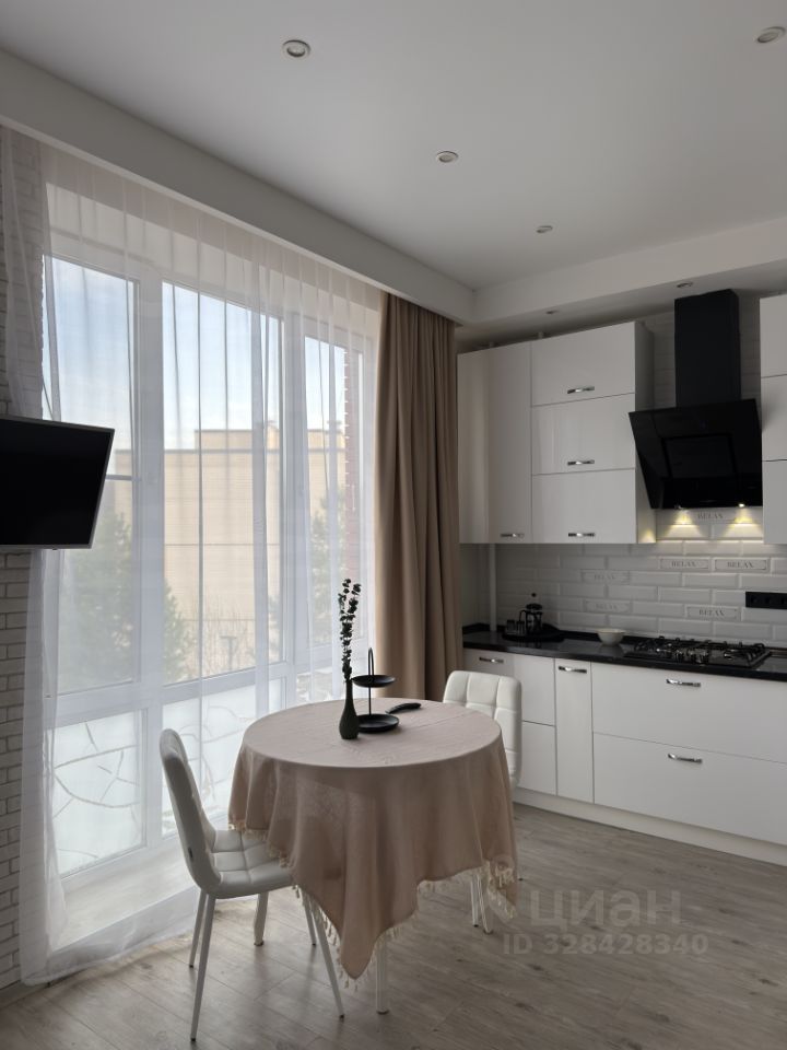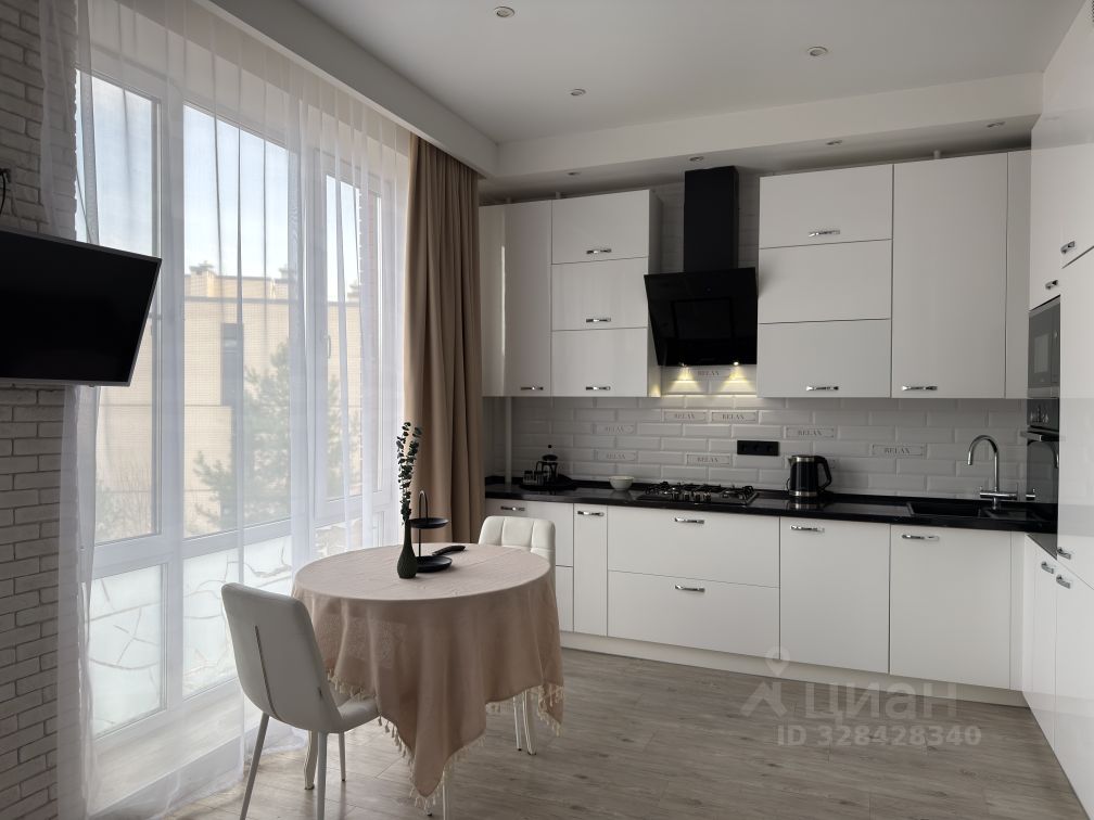 Просторная кухня-гостиная с удобным диваном, телевизор Смарт и качественный кухонный гарнитур (варочная панель, духовой шкаф, микроволновая печь, холодильник, чайник).