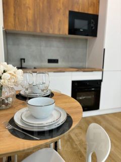 Удобная кухонная зона с новой встроенной техникой, красивой посудой и столовыми принадлежностями за круглым столом могут разместиться 4 человека.