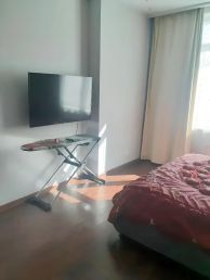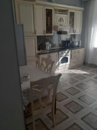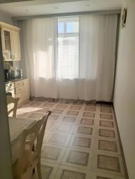 В квартире сделан евроремонт. Просторная кухня оборудована всей необходимой мебелью и техникой, включая холодильник и стиральную машину.