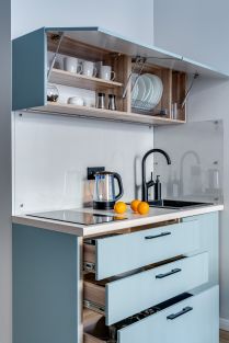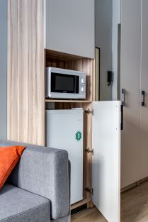 Все необходимое для приема и приготовления пищи: холодильник с морозильной камерой, микроволновая печь, чайник, посуда, столовые приборы.