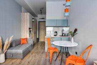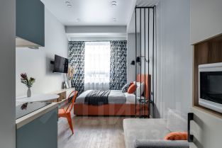 Уютная студия с высокими потолками в современном жилом корпусе с лобби, камином и круглосуточной охраной.
