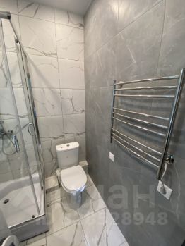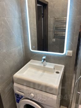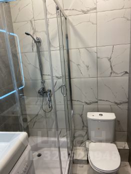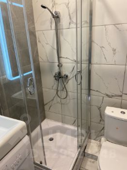 Двустворчатый шкаф с большим зеркалом ,пуф,полка для обуви.В санузле установлена современная душевая кабина и стиральная машина.