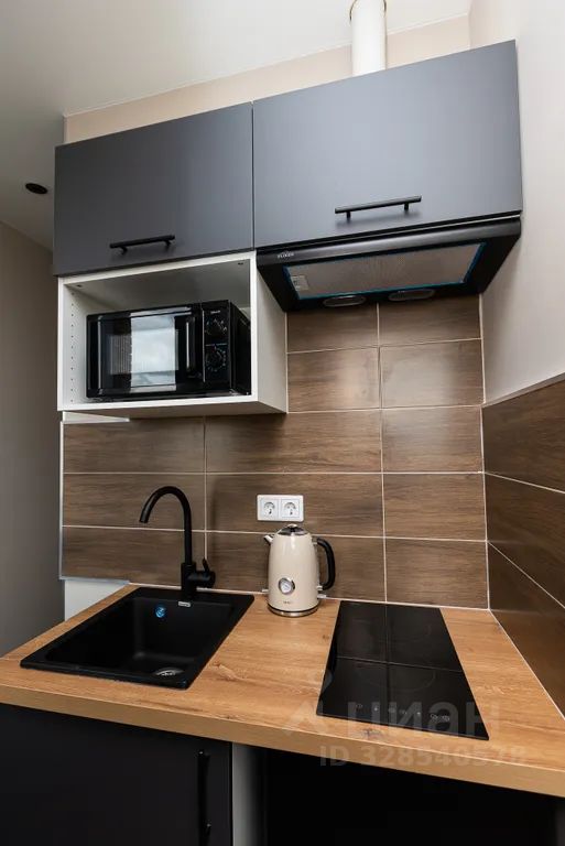 - Кухня с холодильником, плитой, микроволновкой, чайником и посудой