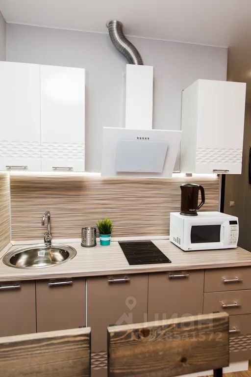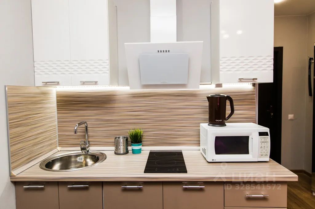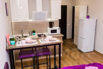 - Кухня с холодильником, плитой, микроволновкой, чайником и посудой