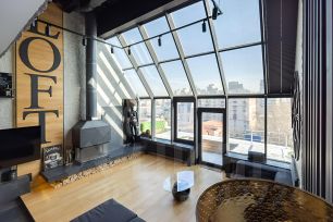 Пентхаус с настоящим дровяным камином, вторым светом за счет высокого потолка (6 метров) и уютной террасой погрузит Вас в атмосферу загородной резиденции в центре города и подарит незабываемые ощущения во время проживания. Высокие потолки с панорамным остеклением наполняют пентхаус светом и воздухом заряжая энергией и позитивом, а прекрасные виды, которые открываются с террасы на центр города и Москва-реку с курсирующими яхтами и пароходами создадут романтическое настроение и расслабление после напряженного дня для Вас и Вашего партнера. Загородная жизнь в центре города это реально!!!