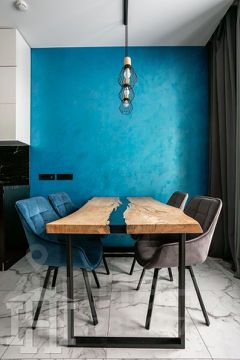 Кухня гостиная: встроенная кухня с полной техникой (холодильник, духовой шкаф, СВЧ, посудомоечная машина, винный шкаф, измельчитель отходов), большой бар, обеденный стол на заказ из массива с эпоксидной заливкой, мягкая зона с просторным раскладным диваном и смарт TV 65".
