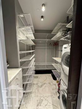 Просторный коридор с большой гардеробной: постирочная зона (стиральная и сушильная машины), система хранения, трюмо.
