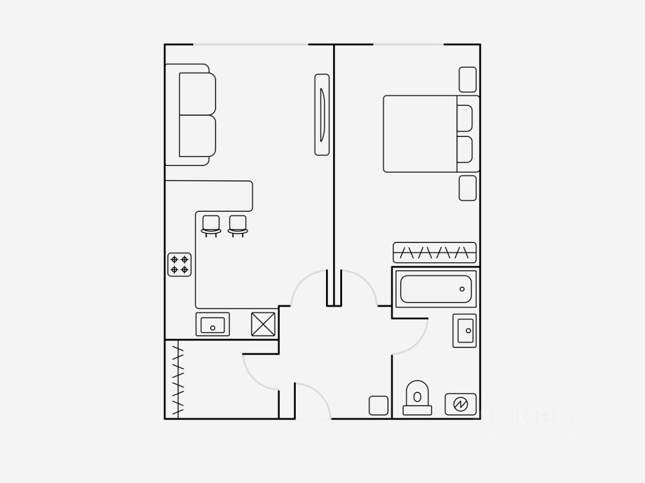 Просторная, 2-комнатная квартира 3413 с гардеробной, евро- планировка (кухня-гостиная + спальня+ санузел), с высокими потолками, площадью 61 м2, расположенная на девятнадцатом этаже нового арендного дома Матч Поинт.