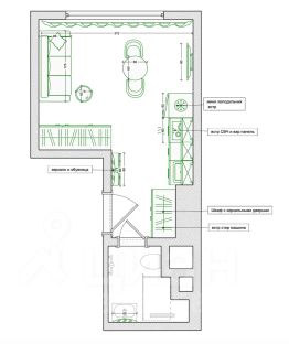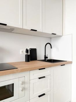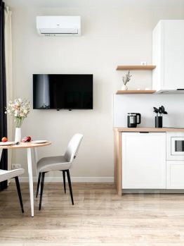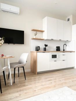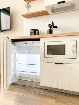 техника вся новая: встроенный холодильник, стиральная машина, микроволновка, чайник, варочная панель, телевизор и кондиционер.