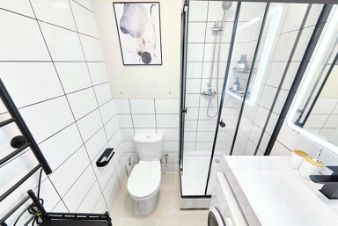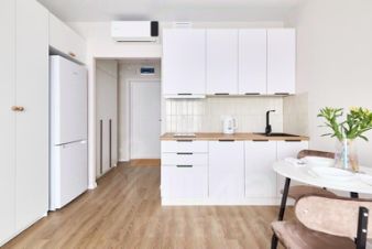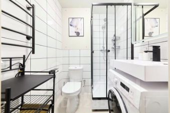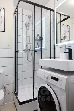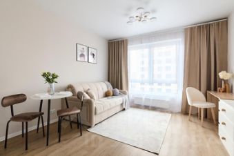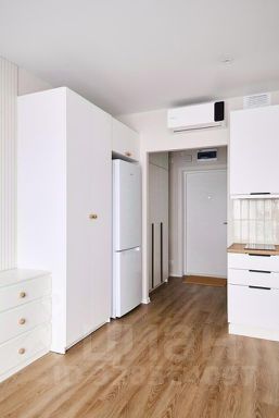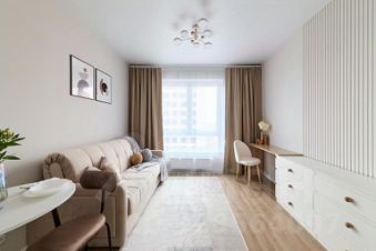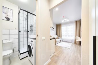 Общая площадь: 22 кв. м. Пол: ламинат + плитка. Комната 10,8 кв. м. (с раскладным диваном, большим шкафом, тумбой) + кухня-ниша 5,6 кв. м. (со встроенной кухонной мебелью, варочной панелью, вытяжкой), отдельный холодильник, кондиционер. Санузел совместный в плитке (душевая кабина) со стиральной машинкой. В коридоре большой шкаф-купе.