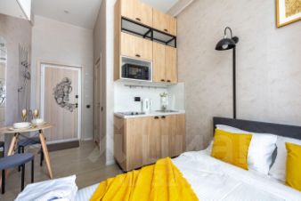 - Приготовить завтрак вы сможете на небольшой, но функциональной кухне. Для этого есть все необходимое: кастрюля, сковорода, набор столовых приборов и посуда.