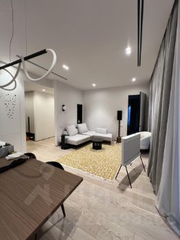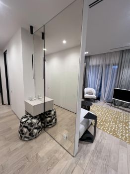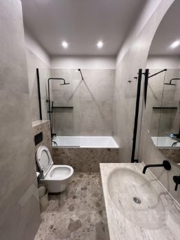 В квартире сделан дизайнерский ремонт, который подчеркивает современный стиль и уют. Здесь есть все необходимое для комфортного проживания: кондиционер, холодильник, посудомоечная и стиральная машины, телевизор. На кухне и в комнате установлена стильная мебель. Два совмещенных санузла оборудованы ванной и душевой кабиной, что особенно удобно для семьи или совместного проживания нескольких человек.