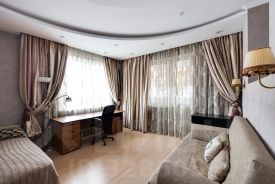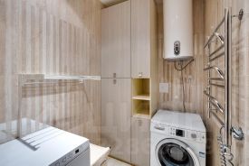 Функциональное пространство зонировано на кухню-гостиную, основную спальню, детскую комнату, просторный санузел, постирочную и отдельную гардеробную комнату, на уютном балконе оборудован кабинет.