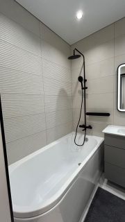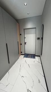 - Отделка: В комнатах — качественная инженерная доска, остальное - широкоформатный кафель (1200х1200).
