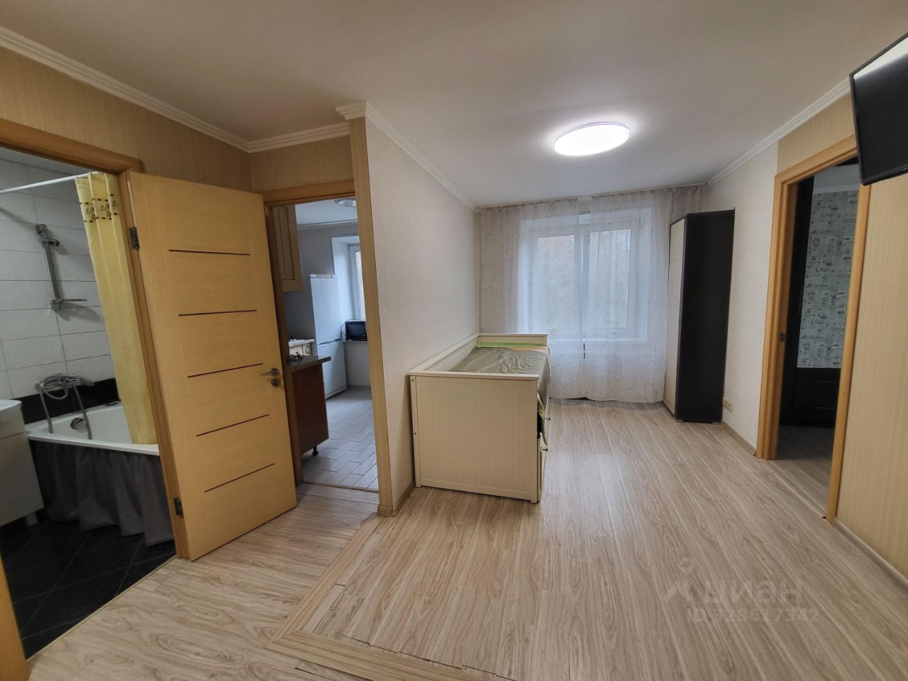 В квартире сделан косметический ремонт, что позволяет сразу заехать и жить. Планировка включает три просторные комнаты с мебелью и кухню площадью 6 кв. м, где также есть необходимая мебель. На кухне и в комнатах установлена техника: холодильник, телевизор и стиральная машина. Санузел совмещенный, с ванной, а окна выходят как во двор, так и на улицу, обеспечивая хорошую освещенность в течение дня. Есть балкон для вечерних посиделок.