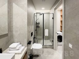 - Ванная комната: Душевая кабина, зеркало, санузел, постирочная зона со стиральной машиной 2в1 сушилкой и теплый пол.