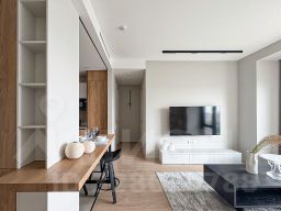 - гостиная зона: телевизор, диван (раскладывается), пуфик, стильный журнальный столик;