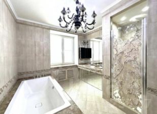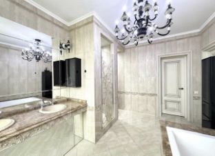 - мастер-спальня с собственной гардеробной и большой ванной зоной с окном (ванна и душевая), выполненной в мраморе от пола до потолка