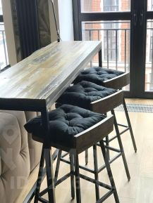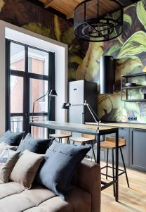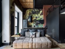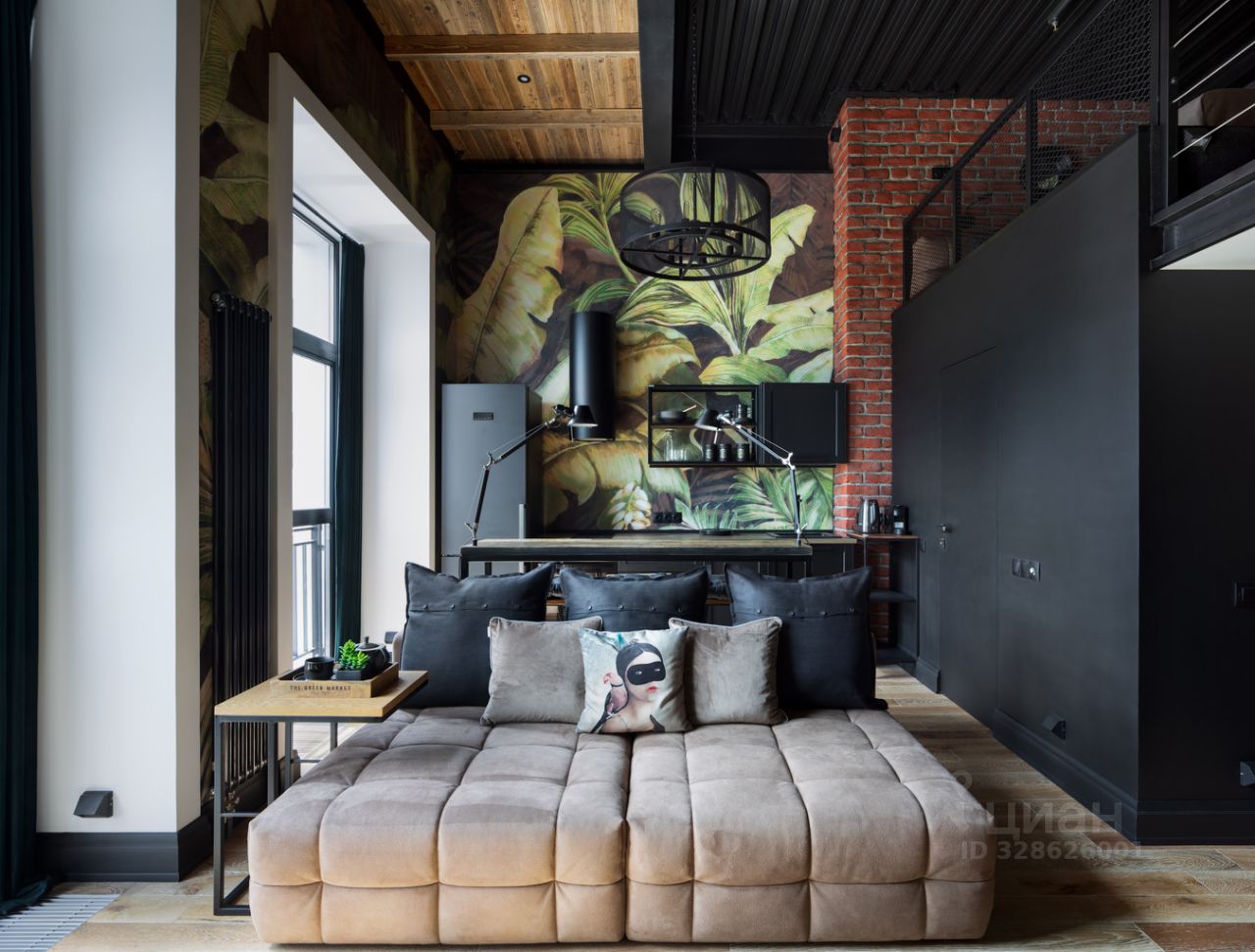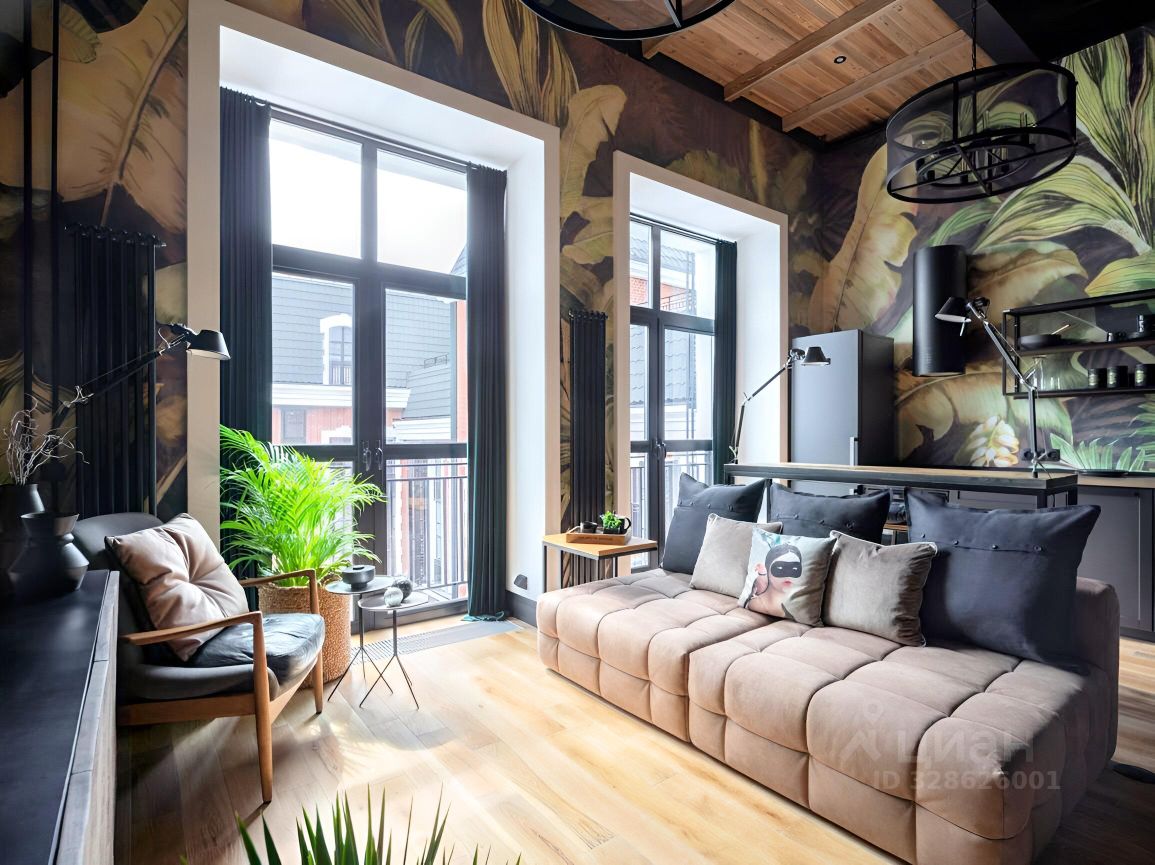 Общая площадь с антресолью 2-го этажа 43кв.м. Высота потолка 4,5м, французские окна высотой 3м, качественные отделочные материалы, комфортная планировка. Спальня организована на 2-ом этаже; высота потолка 2-го этажа 1,95м.