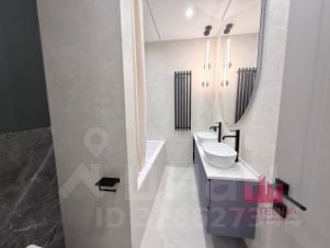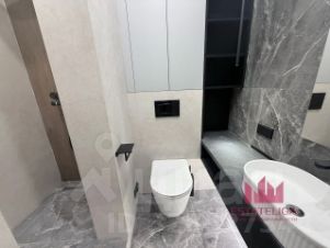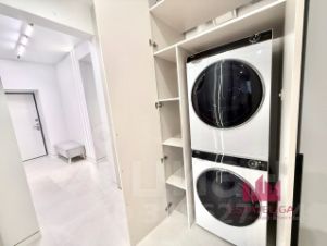 В квартире спроектировано два полноценных санузла. Главный мастер санузел с ванной примыкает с спальне с гардеробной. Второй расположен ближе к зоне-гостиной идеально для гостей, не нарушая личное пространство хозяев. В одном из просторных шкафов скрыта полноценная постирочная: стиральная и сушильная машина установлены друг на друга.
