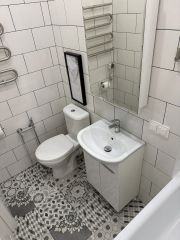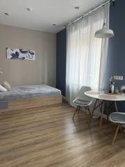 Квартира включает в себя изолированную кухню, оснащенную всей необходимой техникой: посудомоечная машина, духовой шкаф и стиральная машина. В комнате установлен кондиционер, который обеспечит комфортную температуру в любое время года. Спальное место - кровать с подъемным механизмом и местом хранения. В санузле имеется ванная, что добавляет удобства.