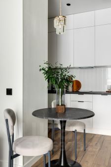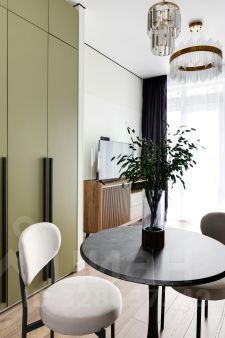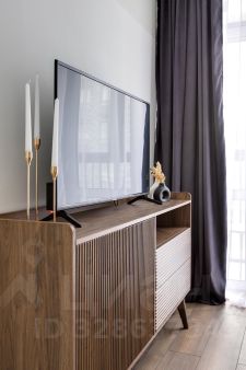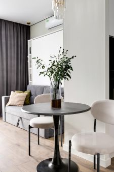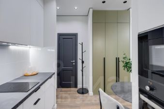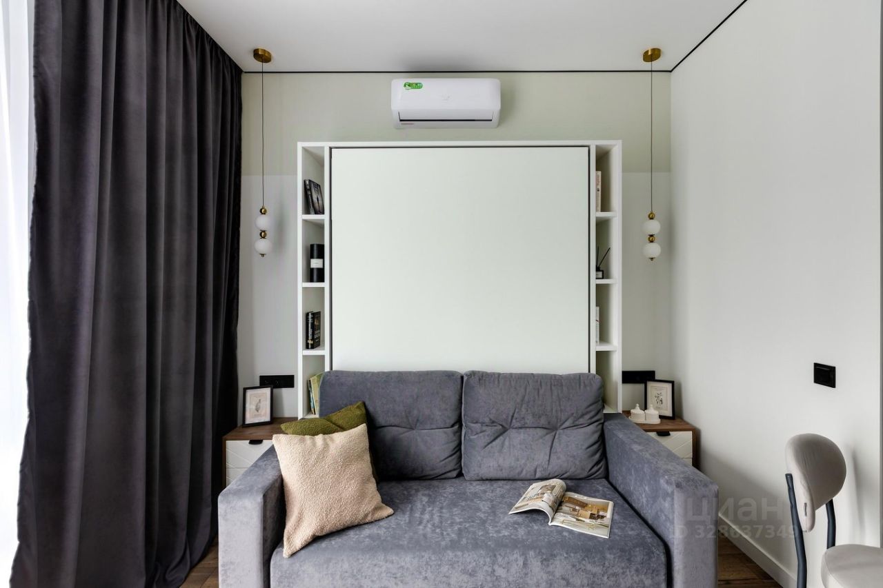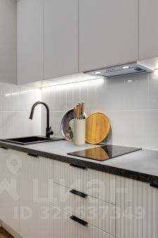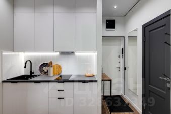 Квартира полностью оборудована современной мебелью и техникой. Эффективно спланированное пространство отделяет кухню от спальной зоны.