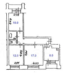 Планировка: Кухня 8 кв.м., жилые, изолированные комнаты 17 + 12 + 10 кв.м., раздельный с/у с ванной и стиральной машиной. Потолки 2.65м.