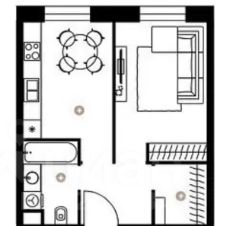 Площать квартиры 40 кв м, большая кухня, комната, холл и санузел, высокие потолки