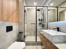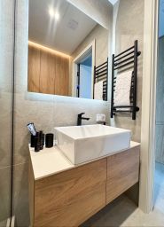 - Ванная комната: Душевая кабина, зеркало, санузел, постирочная зона со стиральной машиной 2в1 сушилкой и теплый пол.