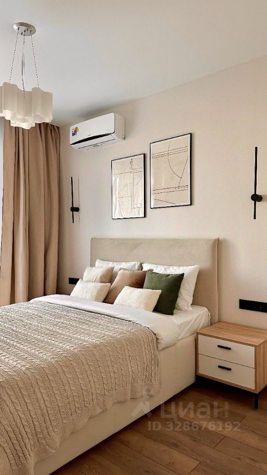 В кухне-гостиной установлены кондиционер, телевизор, удобный диван, стол и вспомогательная мебель. В спальной комнате двуспальная кровать, прикроватные тумбочки, шкаф, TV, кондиционер.