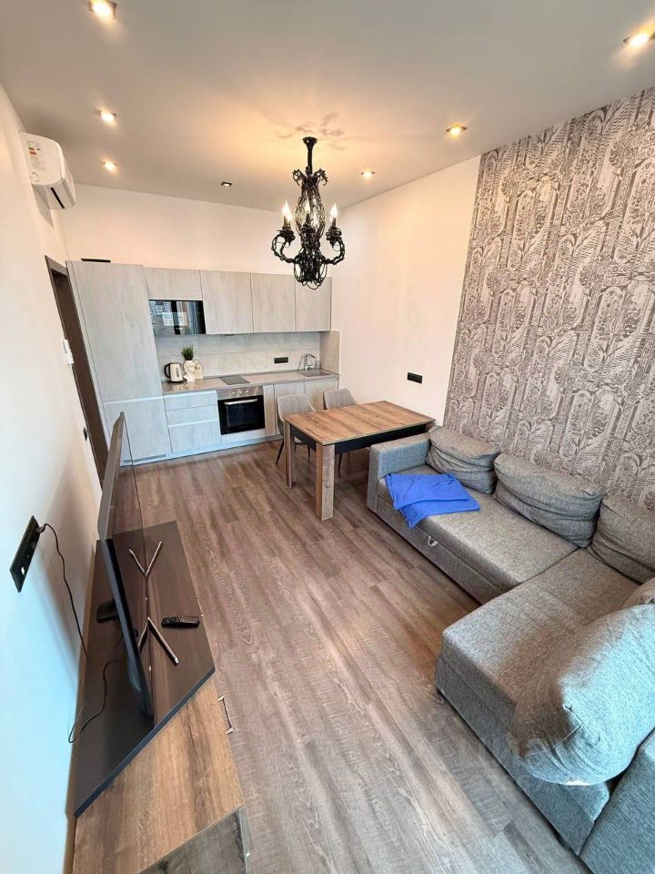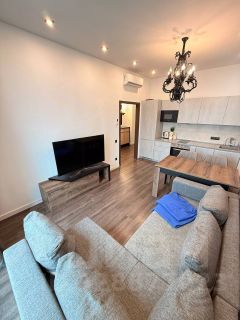 Кухня-гостиная: установлен кухонный гарнитур. Холодильник. Посудомойка. Обеденный стол. Диван. Телевизор. Кондиционер.
