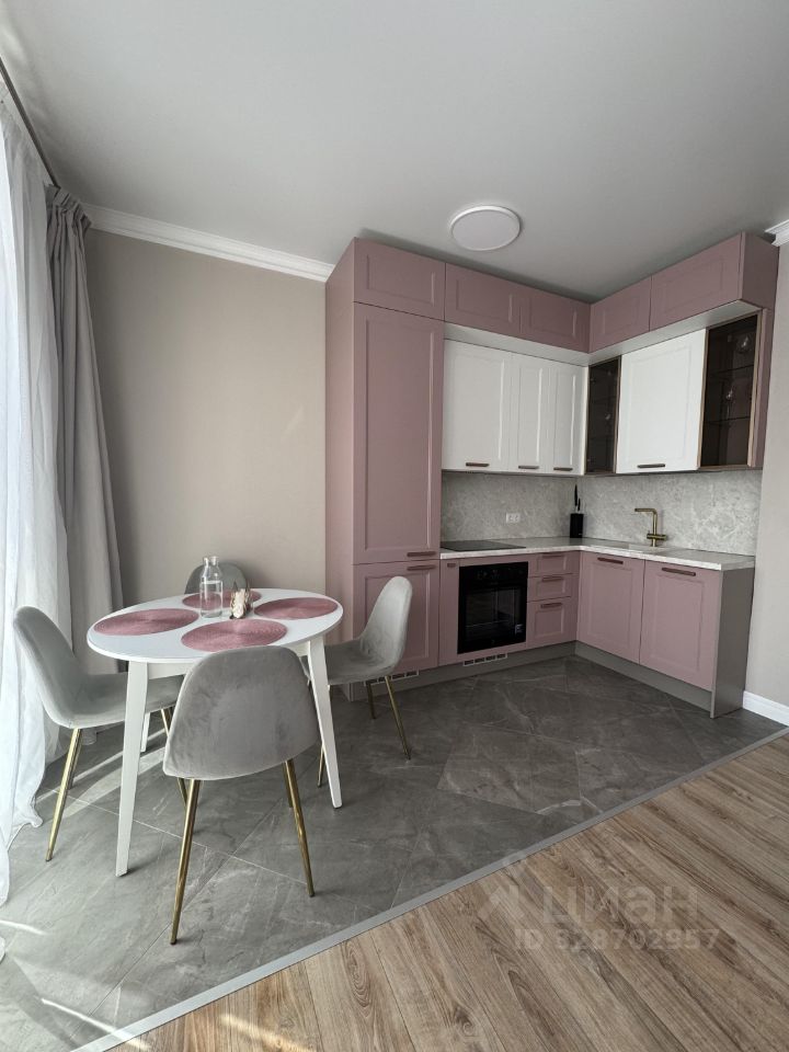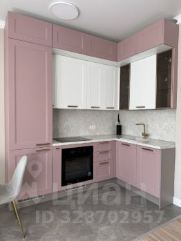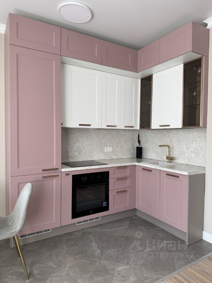 • Современная кухня в приятных розово-белых тонах с красивой и качественной фурнитурой, со всей встроенной техникой: индукционная плита, духовой шкаф, посудомойка, холодильник;