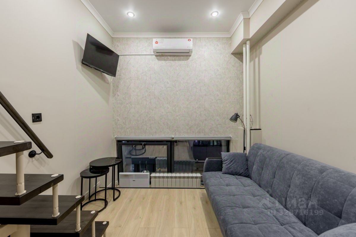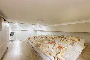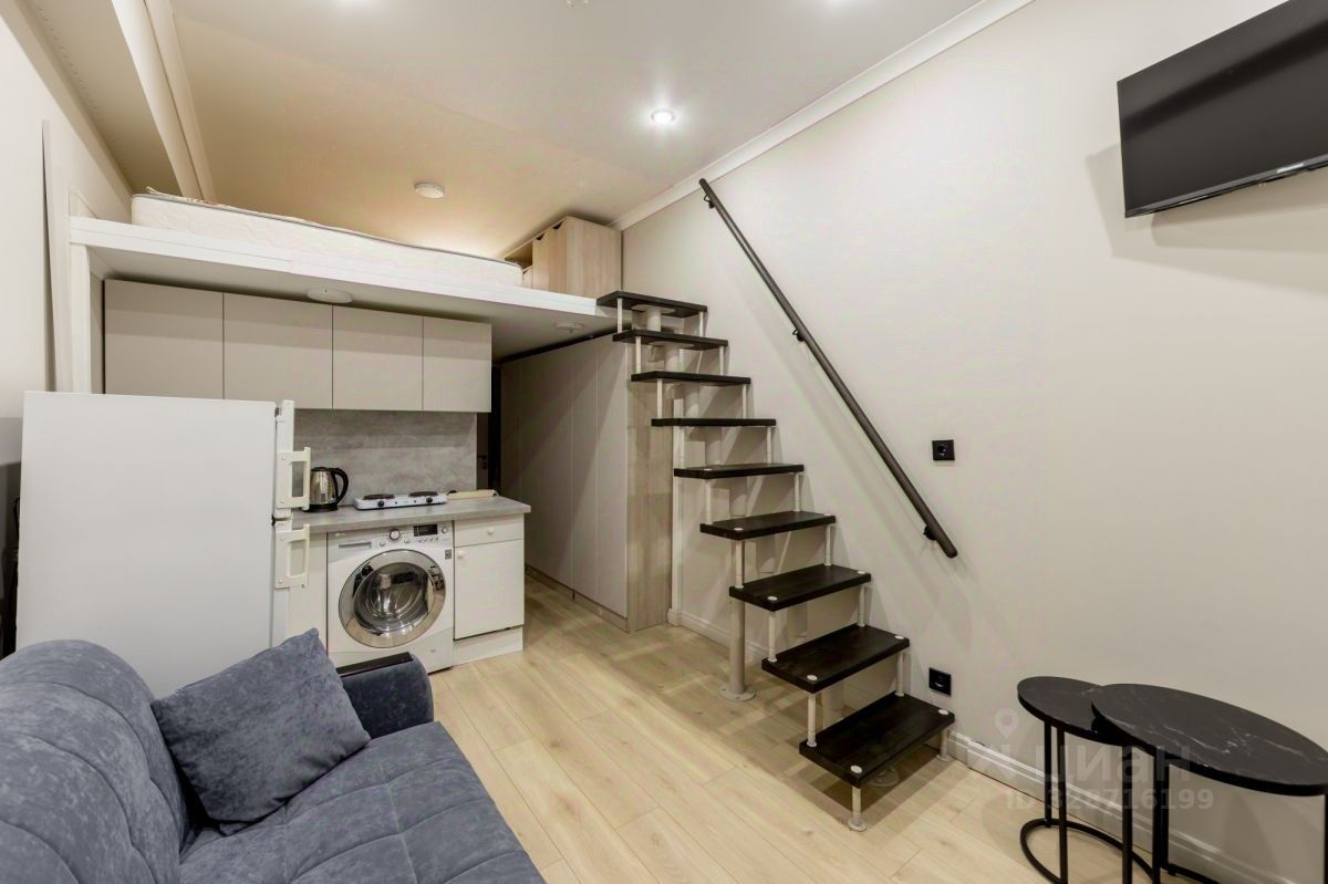 В апартаментах выполнен качественный ремонт. Есть антресоль с двуспальной кроватью и вместительной зоной хранения. На первом уровне: зона кухни, есть электрическая плита, раковина, стиральная машина, кухонный гарнитур, настенный экран для проектора, а также полноценное рабочее место с письменным столом и компьютерным креслом. В зоне гостиной удобный раскладной диван, телевизор, есть wi-fi проектор, кондиционер. Санузел совмещенный, душевая кабина зеркало с подсветкой, раковина. В прихожей удобный шкаф, в котором много пространства для хранения личных вещей. Окна выходят во двор.