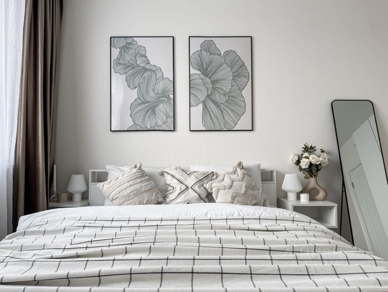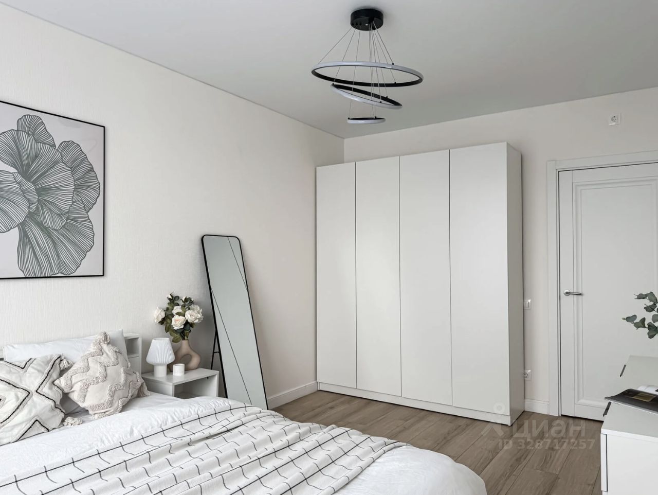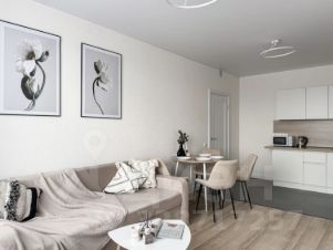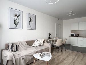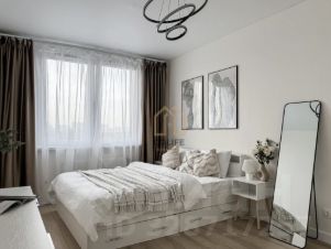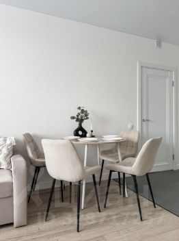 Интерьер квартиры выполнен в современном минималистичном стиле: светлые пастельные оттенки, аккуратный декор и продуманная планировка создают спокойную и уютную атмосферу. Из окон открывается приятный вид на лес.