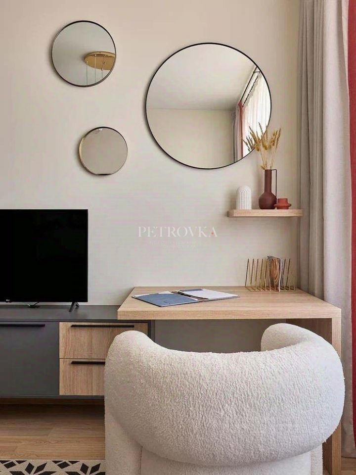 В квартире выполнен современный ремонт с использованием качественных материалов и разнообразных элементов декора , что создает атмосферу уюта и спокойствия. Продуманное освещение, включающее точечные светильники и декоративные бра, позволяет создать желаемую обстановку для любого времени суток.