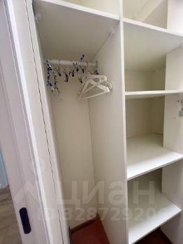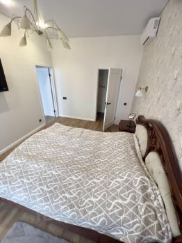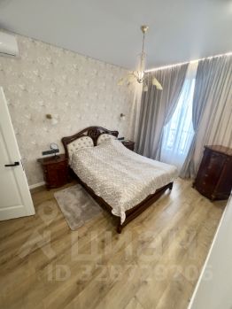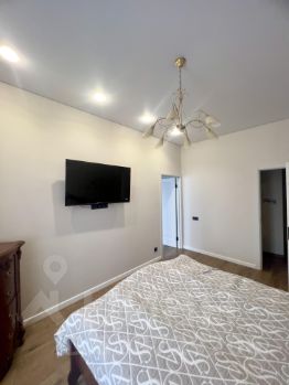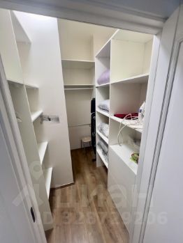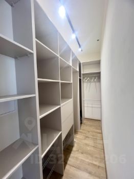 Спальня оформлена в светлых тонах, оснащена двуспальной кроватью и вместительным шкафом. В квартире также имеется две гардеробных комнаты.