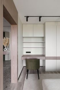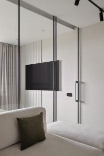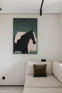 Также в квартире есть ультракороткофокусный проектор Formovie THEATER - один из лучших проекторов предыдущего года. В гостиной установлен 80-дюймовый выдвижной ALR-экран, раскрывающий все преимущества проектора. А на любой светлой стене можно наслаждаться изображением до 150 дюймов.