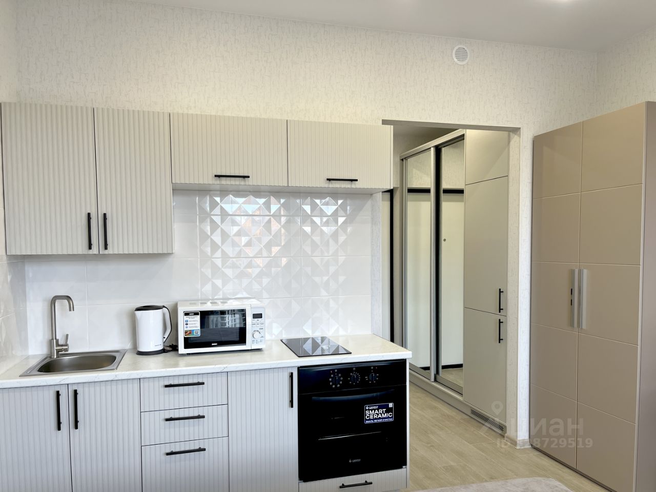 Новая техника (кондиционер, встроенный холодильник, плита, стиральная машина, телевизор, СВЧ).