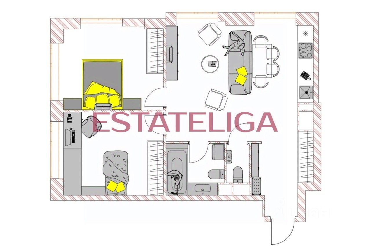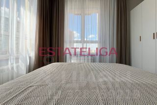 Функциональная планировка квартиры, разработанная по индивидуальному дизайн-проекту: светлая кухня-гостиная, первая изолированная спальня, вторая спальня/кабинет, совмещенный санузел с душем, гостевой санузел, просторный холл. В квартире 5 окон, из-за чего квартира очень светлая и солнечная. Мебель во вторую спальню и телевизор докупается под арендатора.