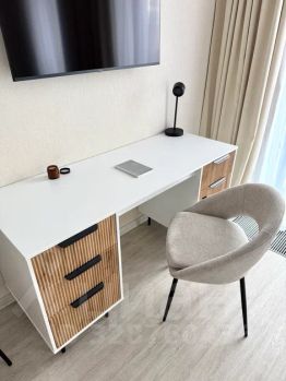 Мeбель: куxoнный гaрнитур со всей необходимой техникой, обеденный стол, диван, рабочий стол, шкаф.