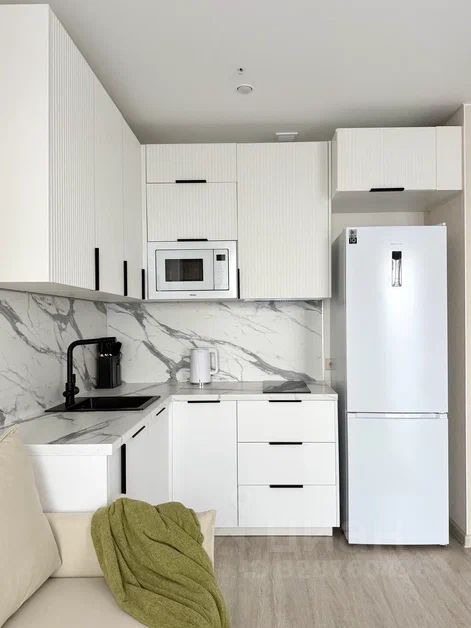 Бытовая техника: холодильник, варочная панель, телевизор, электрический чайник, микроволновая печь, стиральная машина, посудомоечная машина.