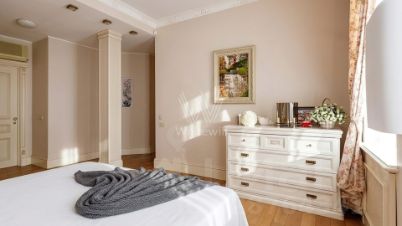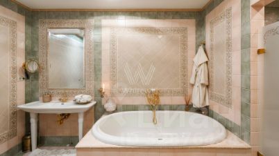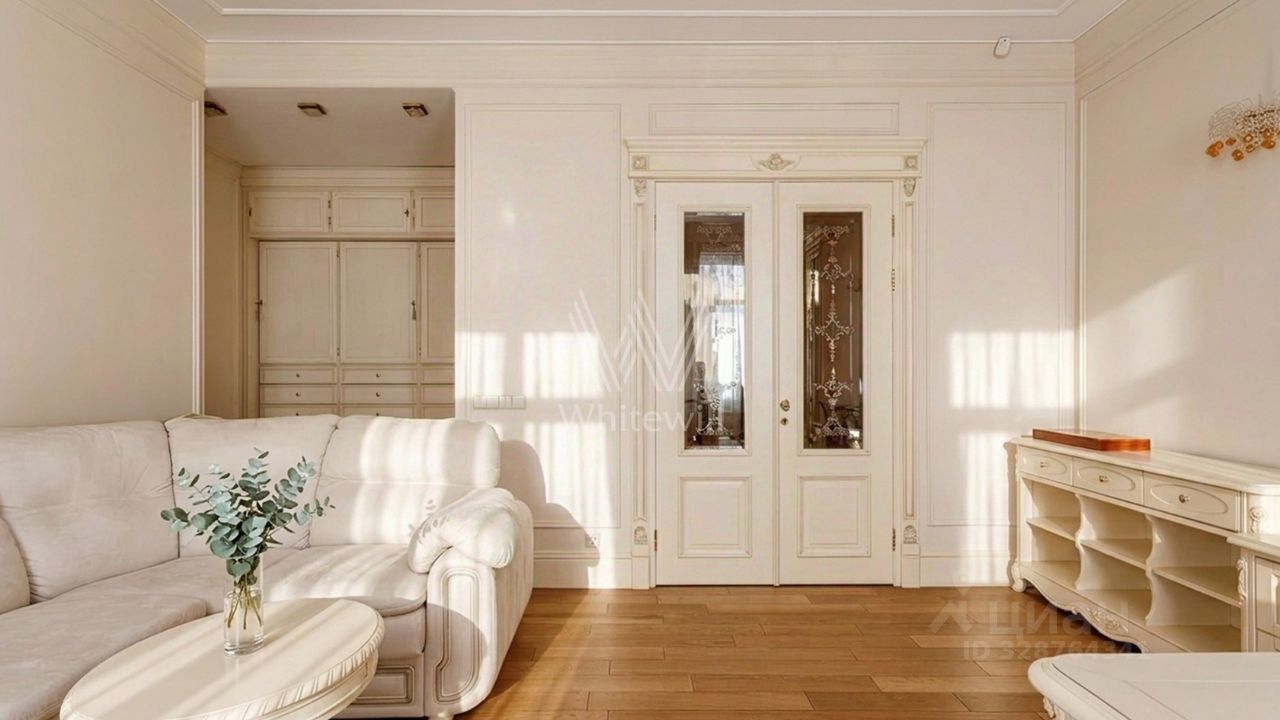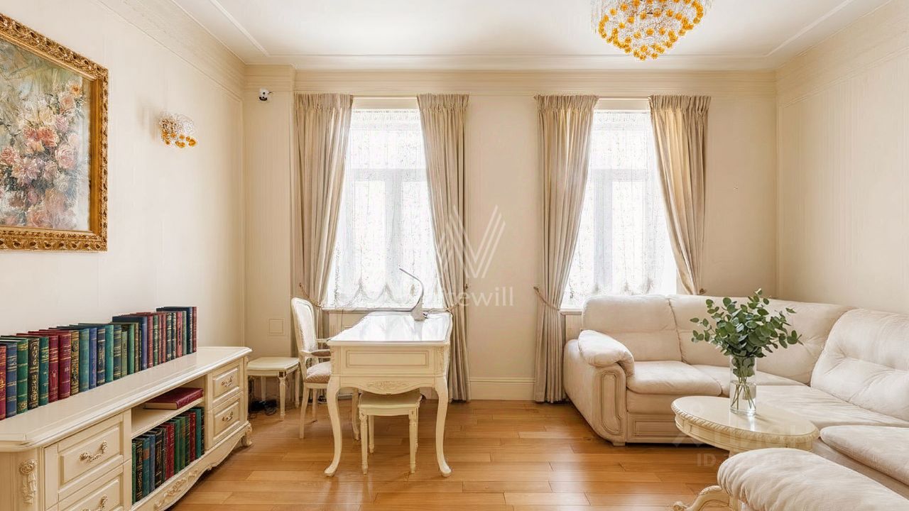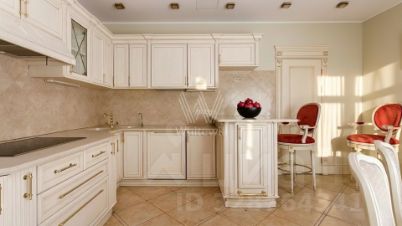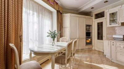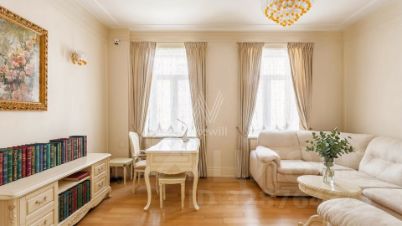 Квартира с тремя спальнями общей площадью 171 м² в доме "Большой Козихинский, 12". Интерьер оформлен в стиле современной классики в приятных светлых тонах, стены украшены молдингами. Квартира полностью меблирована, итальянская кухня оборудована немецкой встроенной бытовой техникой.