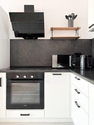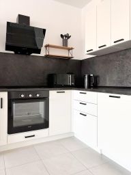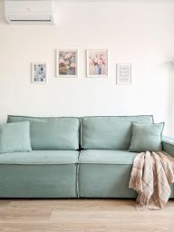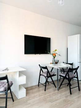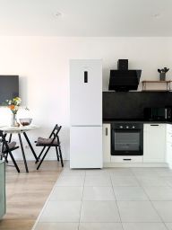 - кухня-гостиная (кондиционер, холодильник, плита, духовой шкаф, посудомойка, микроволновая печь, диван и телевизор)