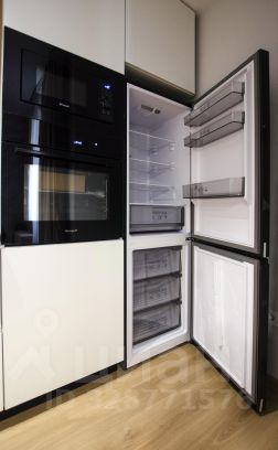 В просторной кухне - функциональное рабочее место, оснащенное современной бытовой техникой, включая духовую печь, варочную панель, СВЧ, вытяжку, двухкамерный холодильник.