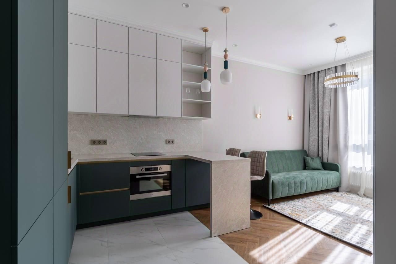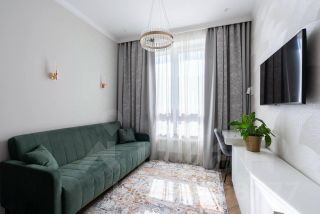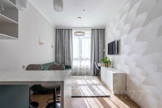 Светлая квартира с индивидуальным интерьерным решением в современном стиле, с высокими потолками и большими окнами, создающие атмосферу простора, с качественной отделкой, мебелью и техникой для жизни